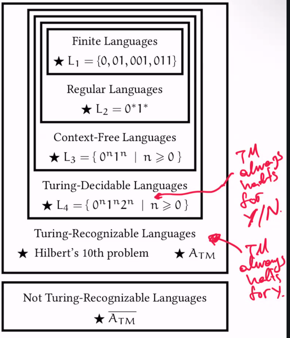- Decidable: Assume determinicst TM, TM accept if inp belongs to language. both yes & no are always answers by the TM