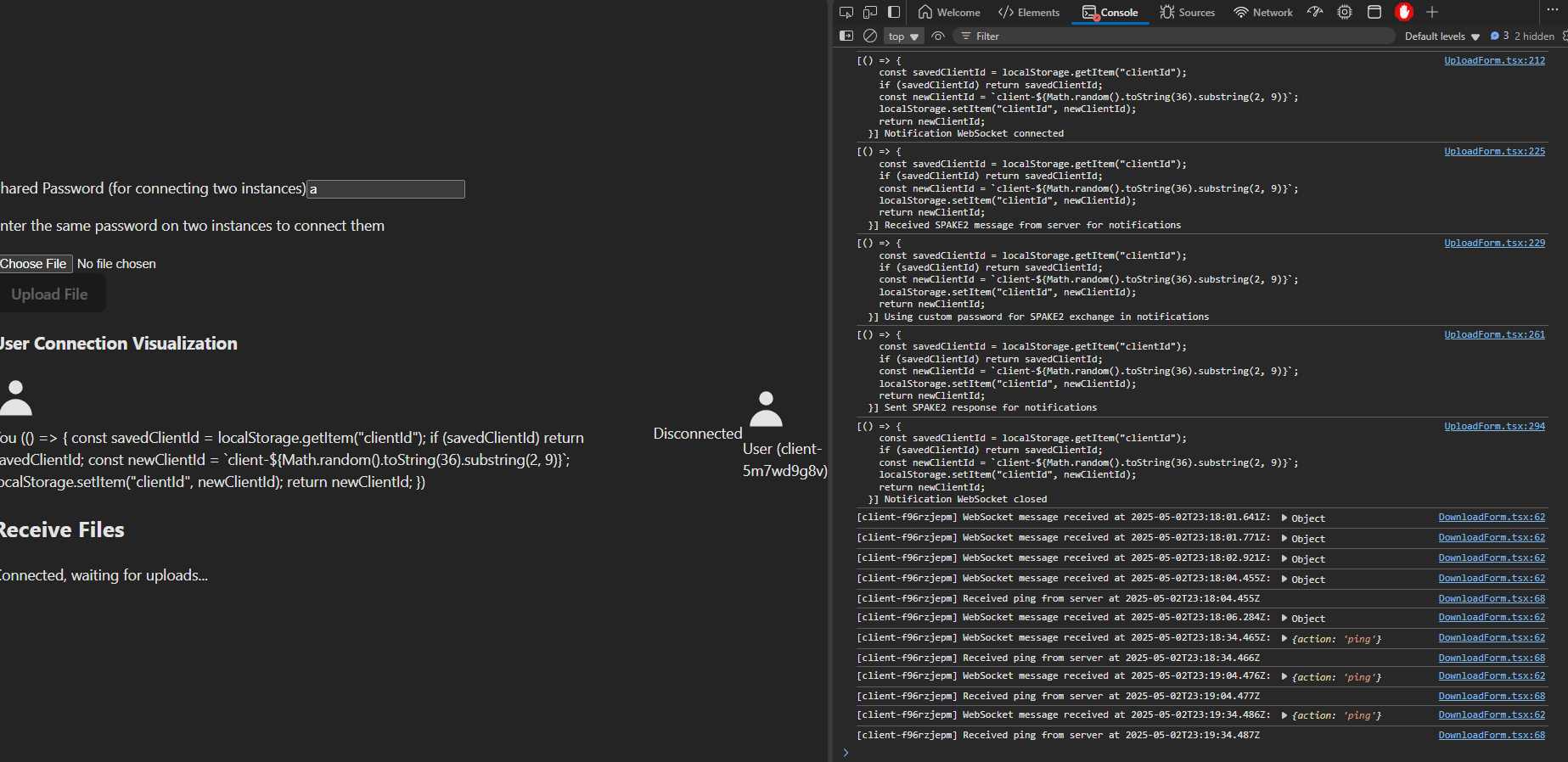 Traditionally, SPAKE2 instances require both sides to agree on two key items: a shared password, and what roles both will play (either as the original client or server). The protocol requires atleast one message exchange to establish the one time unique session key (a second round is optional to check key-confirmation). Once both users obtain the given session key, and an encryption method of the server’s choice, they can then proceed to send messages over a given websocket that the server setups. (Hence the session key acts as the generator for the shared secret key used to encrypt messages). Each message is then encrypted by the session key, and will last for the lifetime of the conversation. Our design was inspired by magic wormhole project.